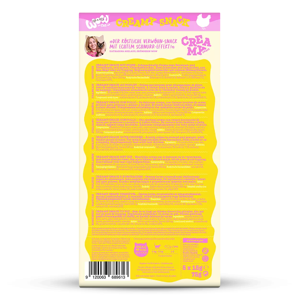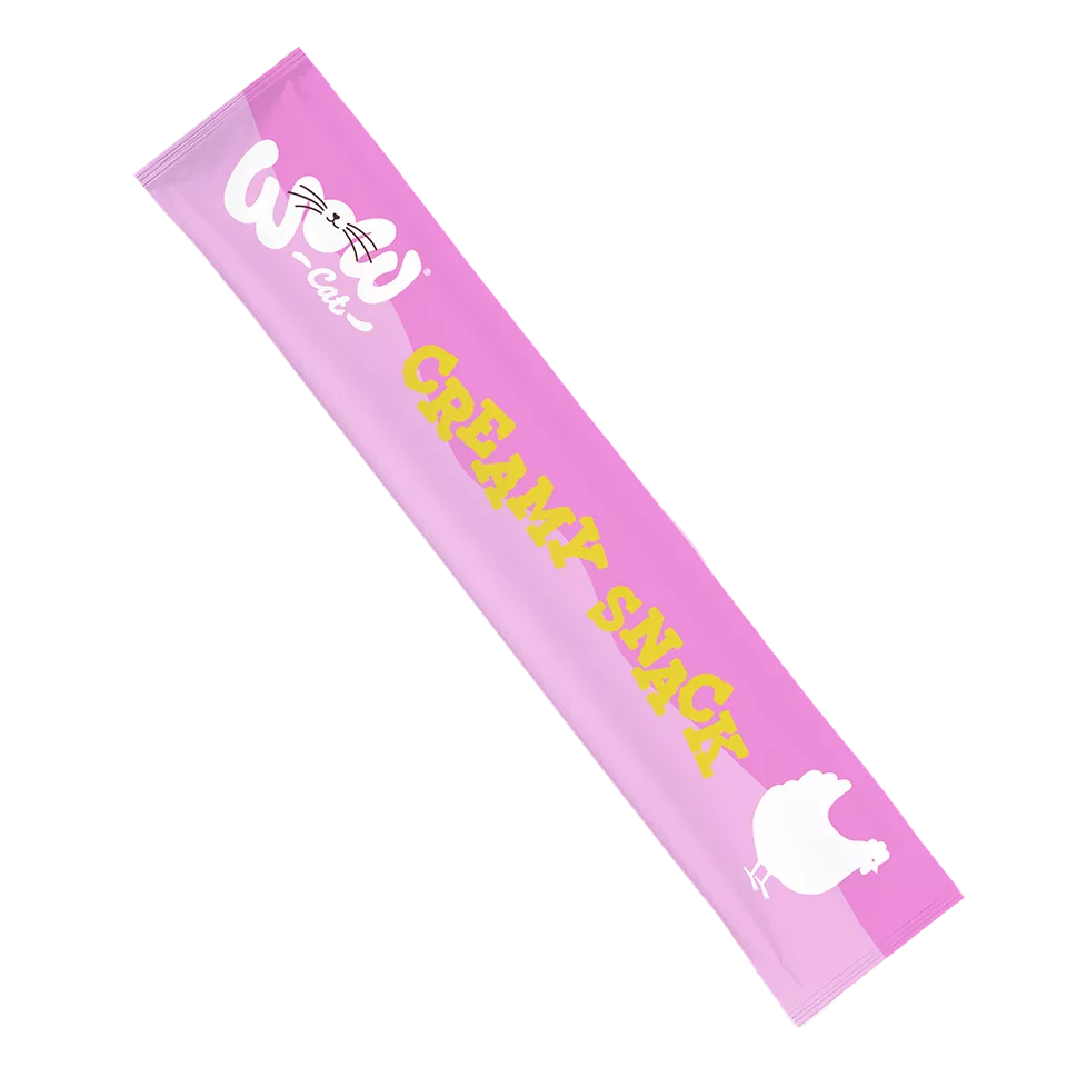 Le Creamy Snack au Poulet de Wow cat est conçu avec de tendres morceaux de viande de poulet, sans gluten, sans céréales et sans sucre ou sel ajouté.