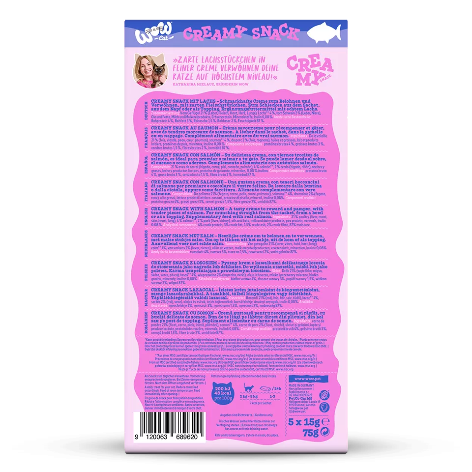 Le Creamy Snack au Saumon de Wow cat est conçu avec de tendres morceaux de poisson, sans gluten, sans céréales et sans sucre ou sel ajouté.