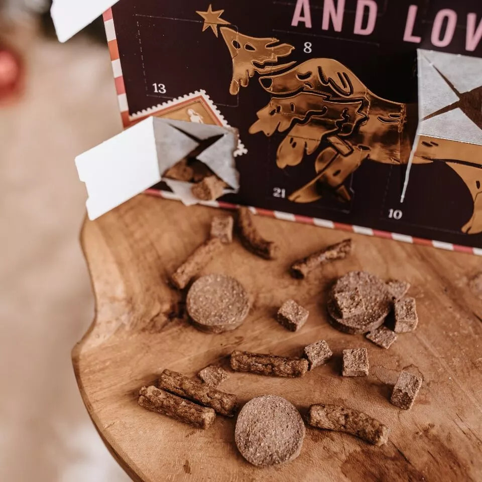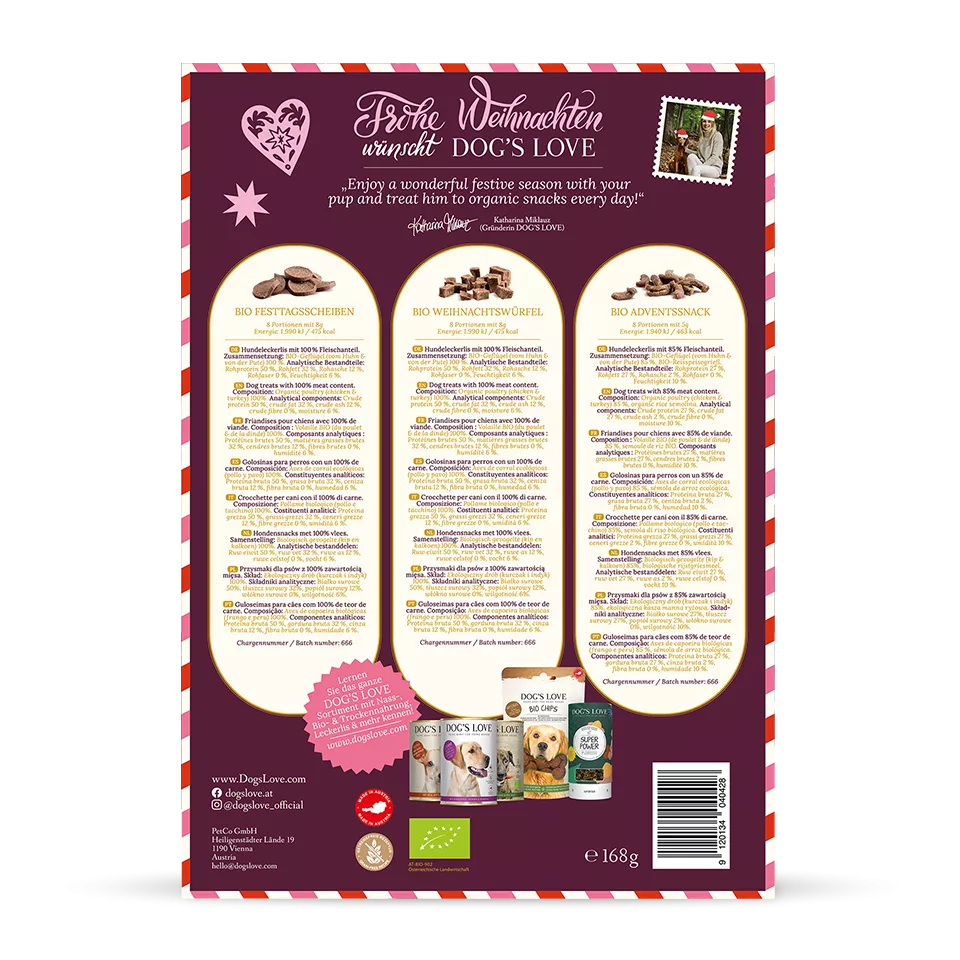 Le calendrier de l'Avent pour chiens de DOG'S LOVE contient 24 portions de friandises bio. Gâtez et surprenez votre chien jour après jour avec ce calendrier en édition limitée.