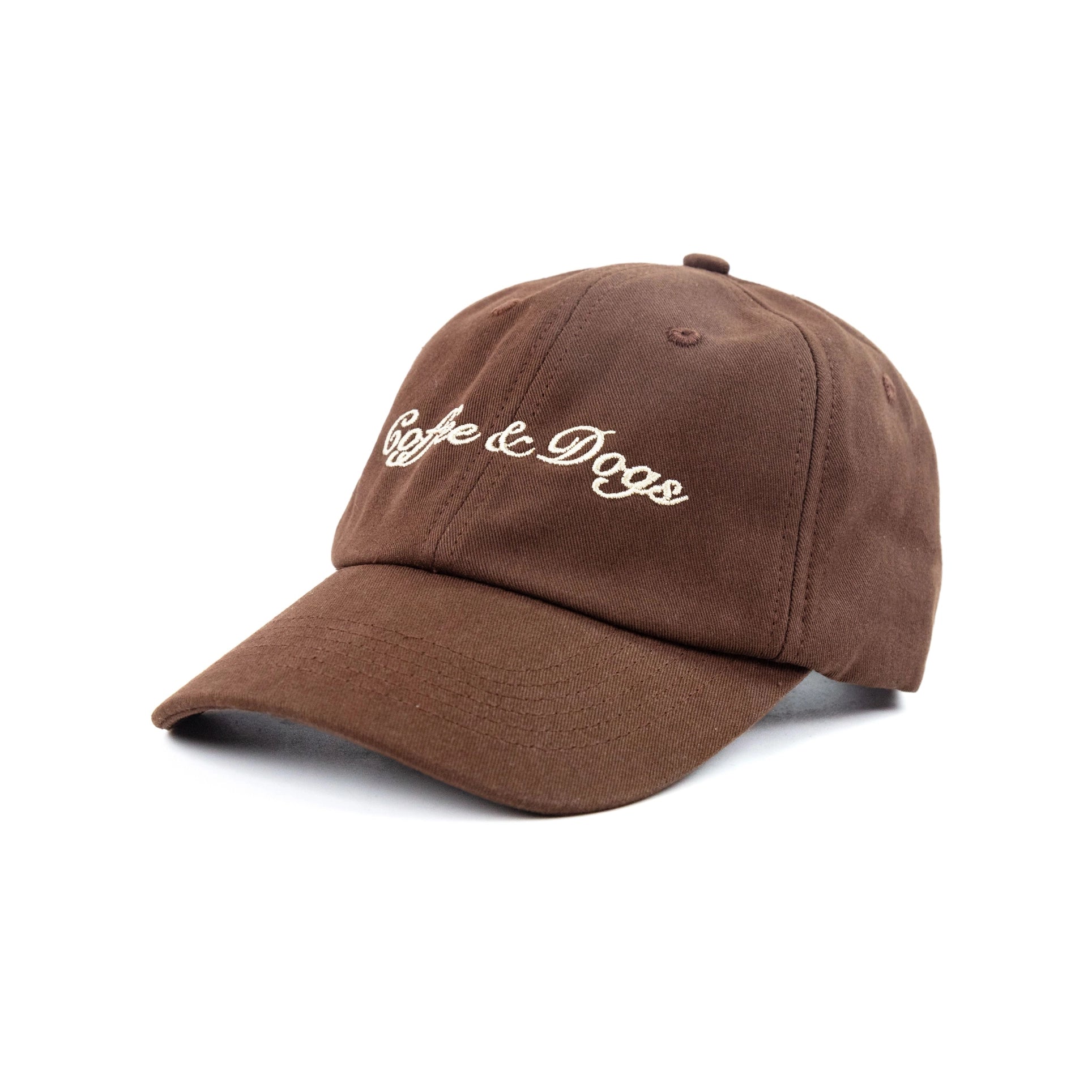 Cette casquette 100 % coton marron est ornée d'une broderie beige « Coffee & Dogs » et d'une sangle réglable.