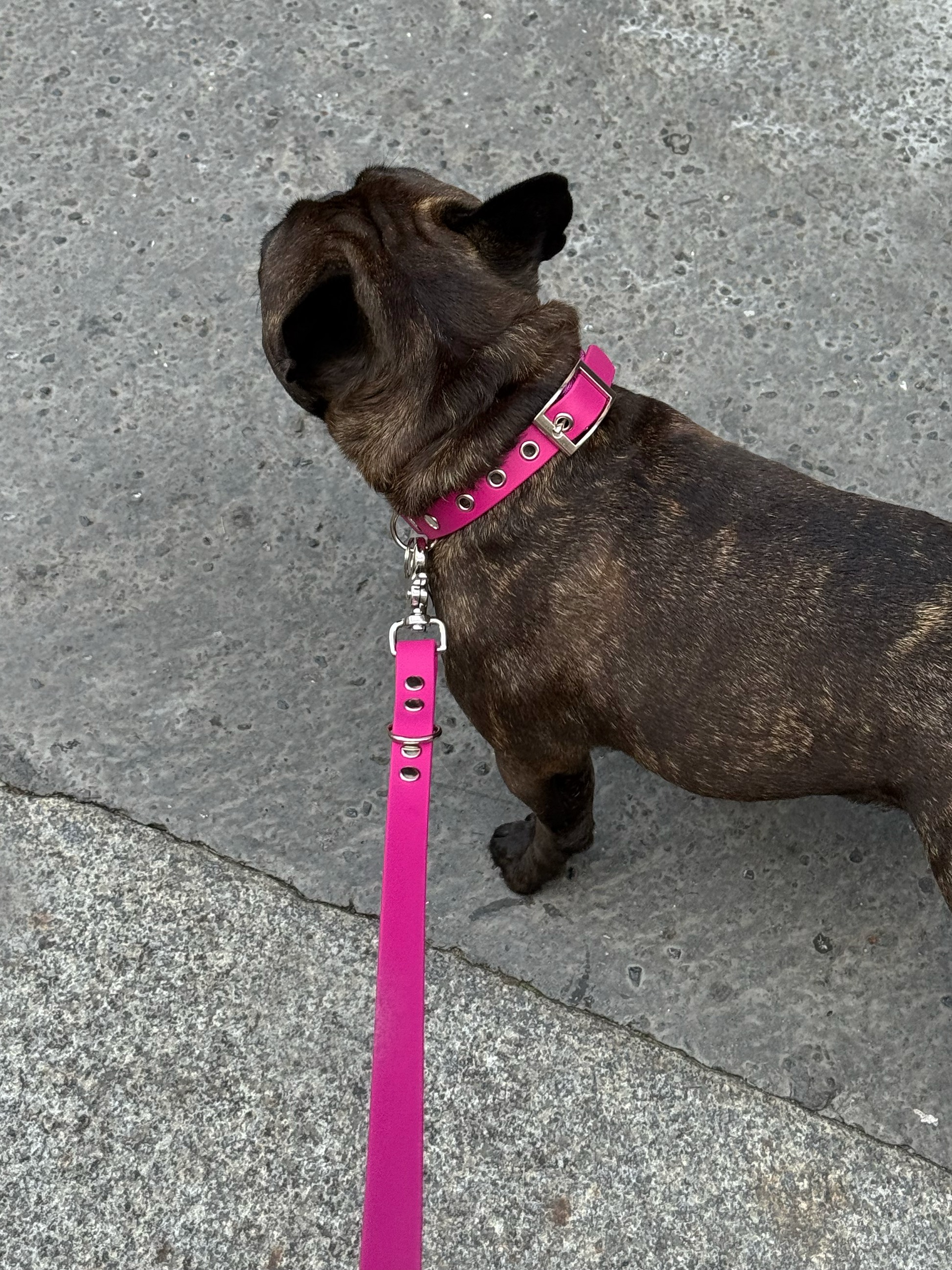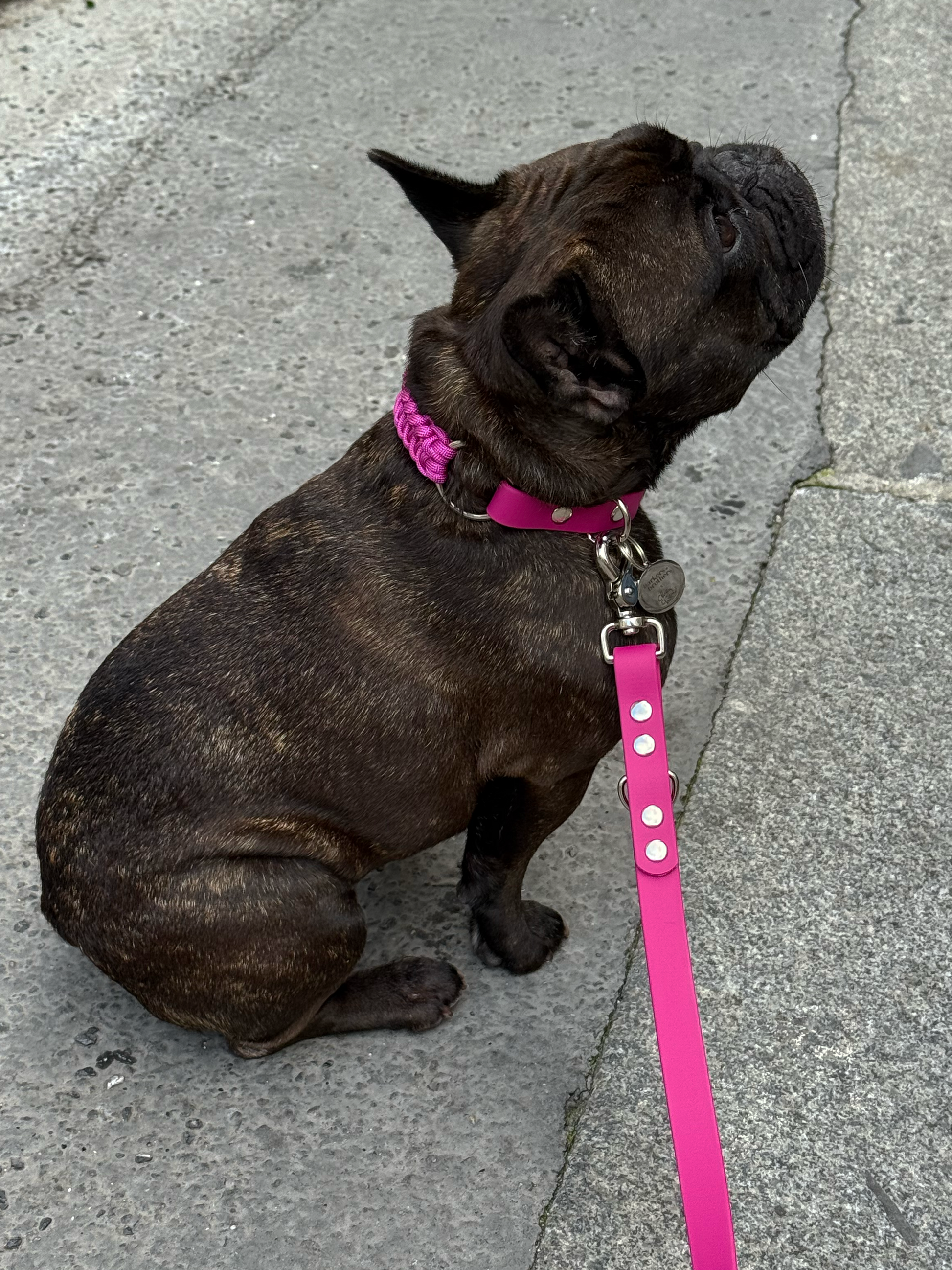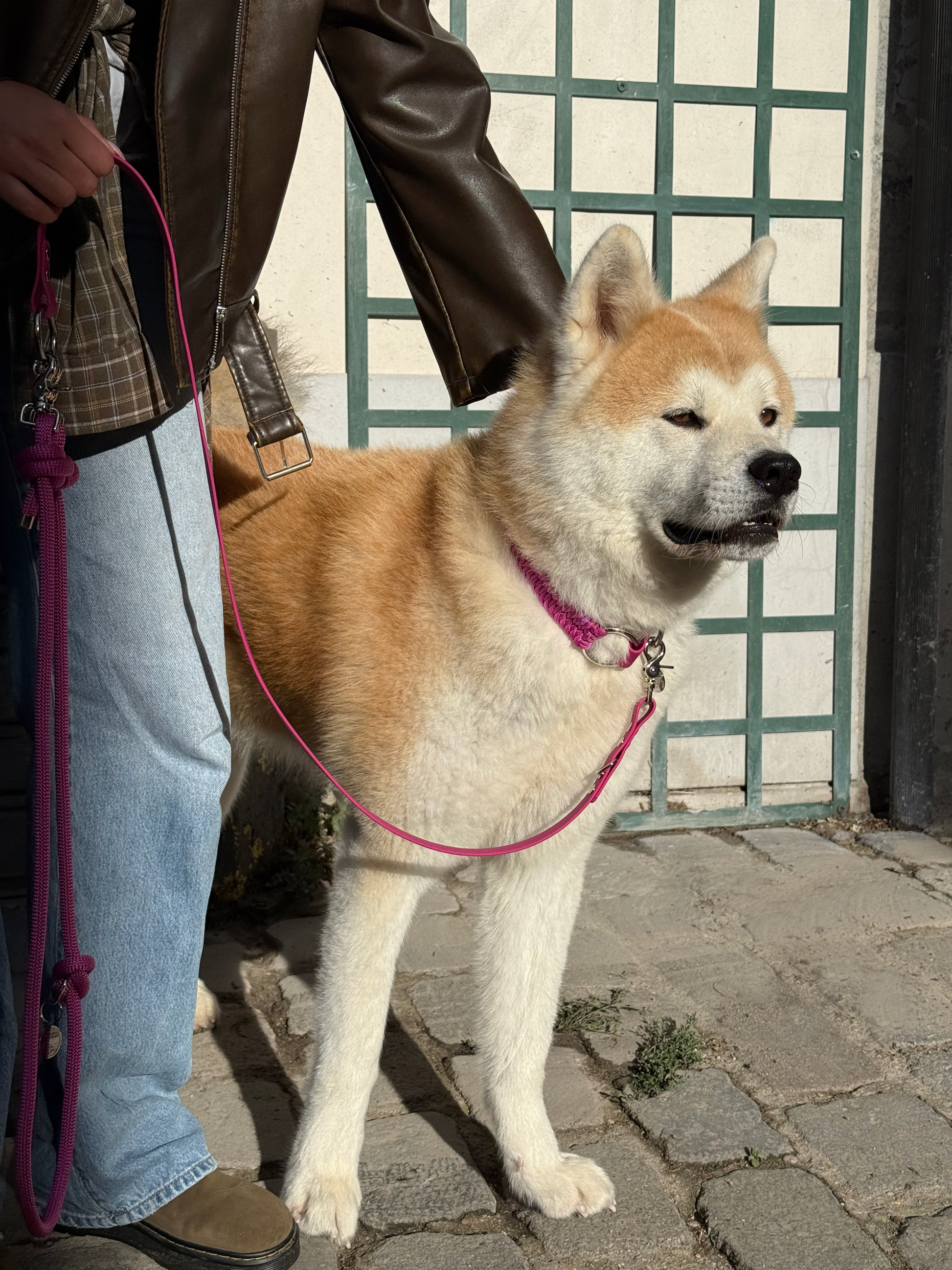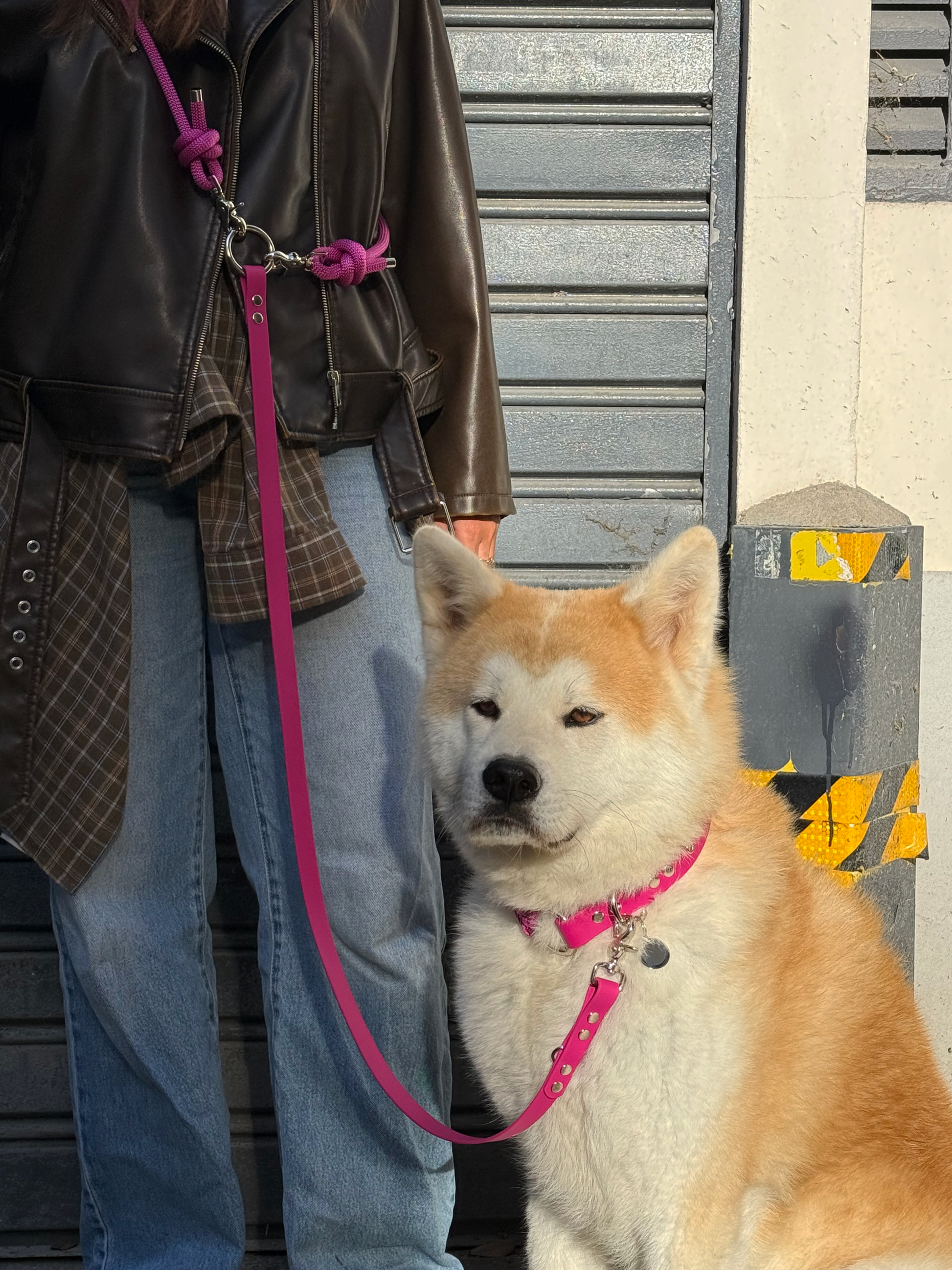 En Biothane© (un matériau innovant, visuellement proche du cuir, vegan, imperméable, facile à nettoyer, sans odeur et extrêmement résistant) et corde en nylon (très résistante à la rupture, tout en étant extrêmement légère et facile à nettoyer).