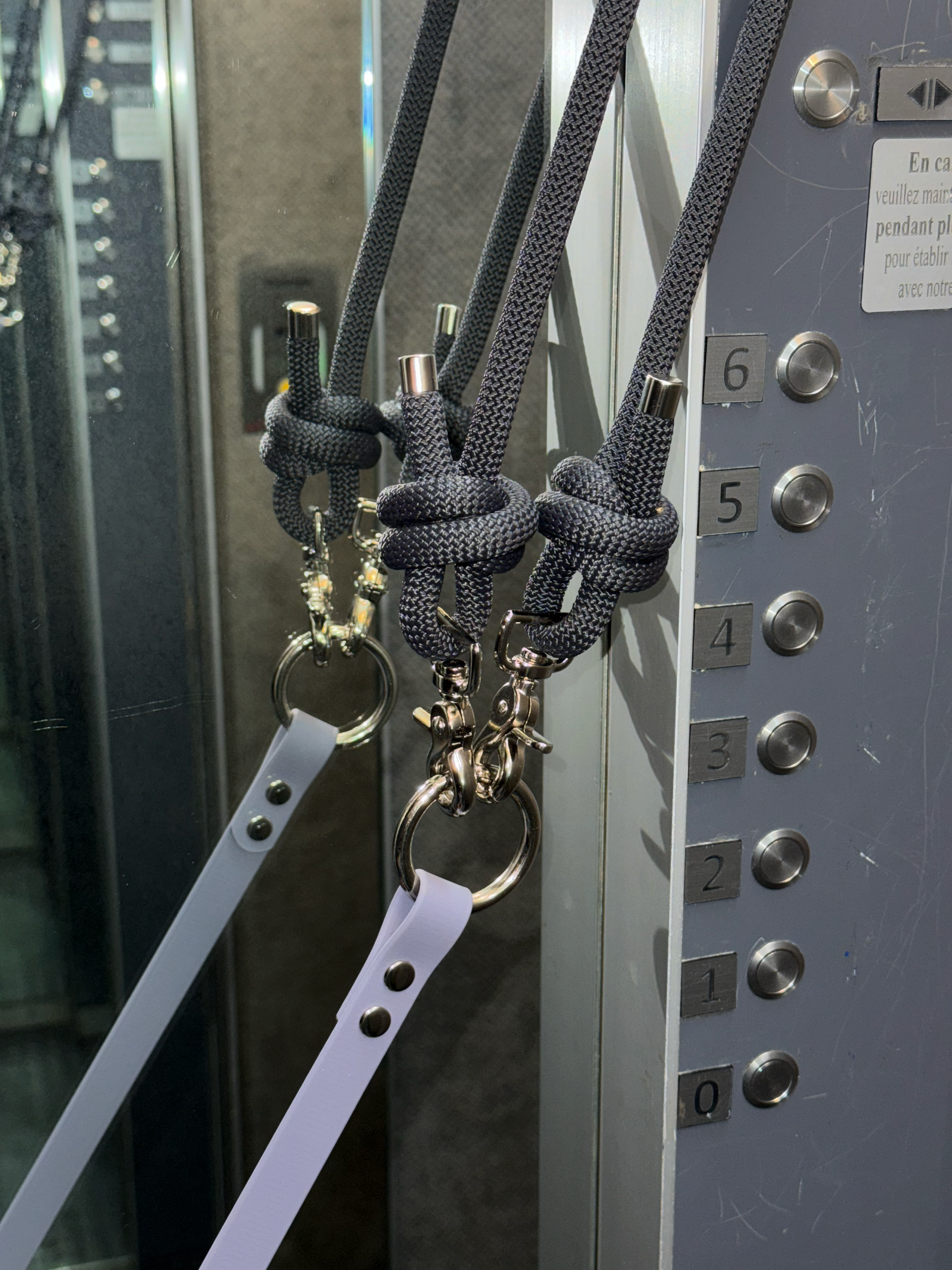 Petit plus, vous avez la possibilité de mixer les coloris de vos laisses en interchangeant les parties en corde à l'aise des deux mousquetons. (Les laisses sont vendues dans un coloris unique. Aucun morceau ne sera vendu séparément).