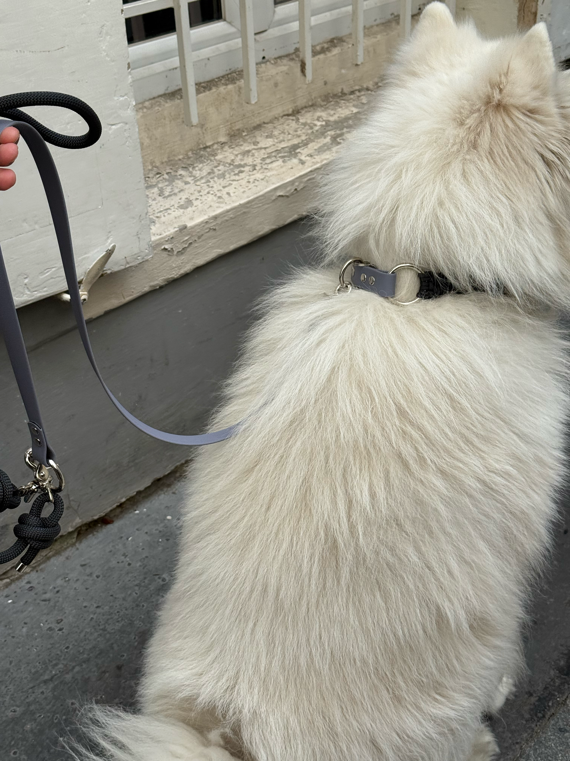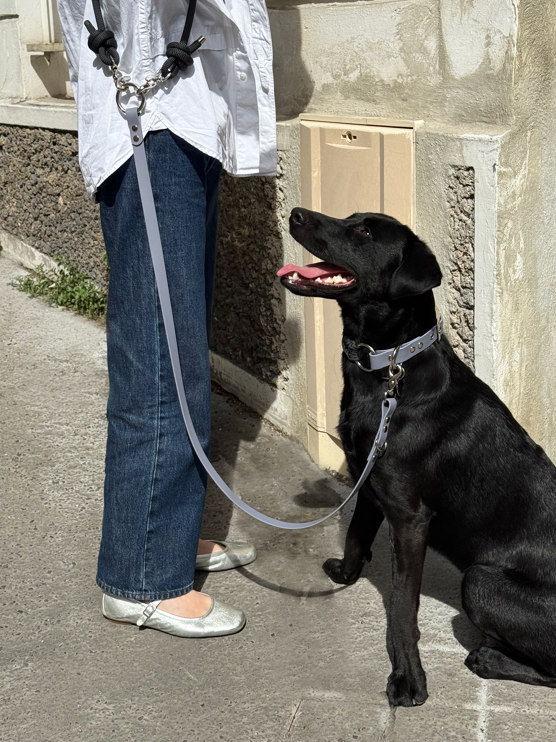 En Biothane© (un matériau innovant, visuellement proche du cuir, vegan, imperméable, facile à nettoyer, sans odeur et extrêmement résistant) et en corde de nylon (très résistante à la rupture, tout en étant extrêmement légère et facile à nettoyer).