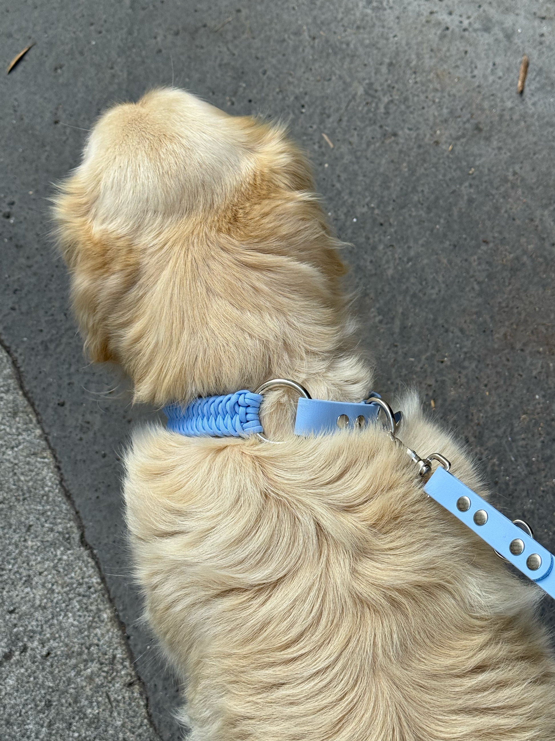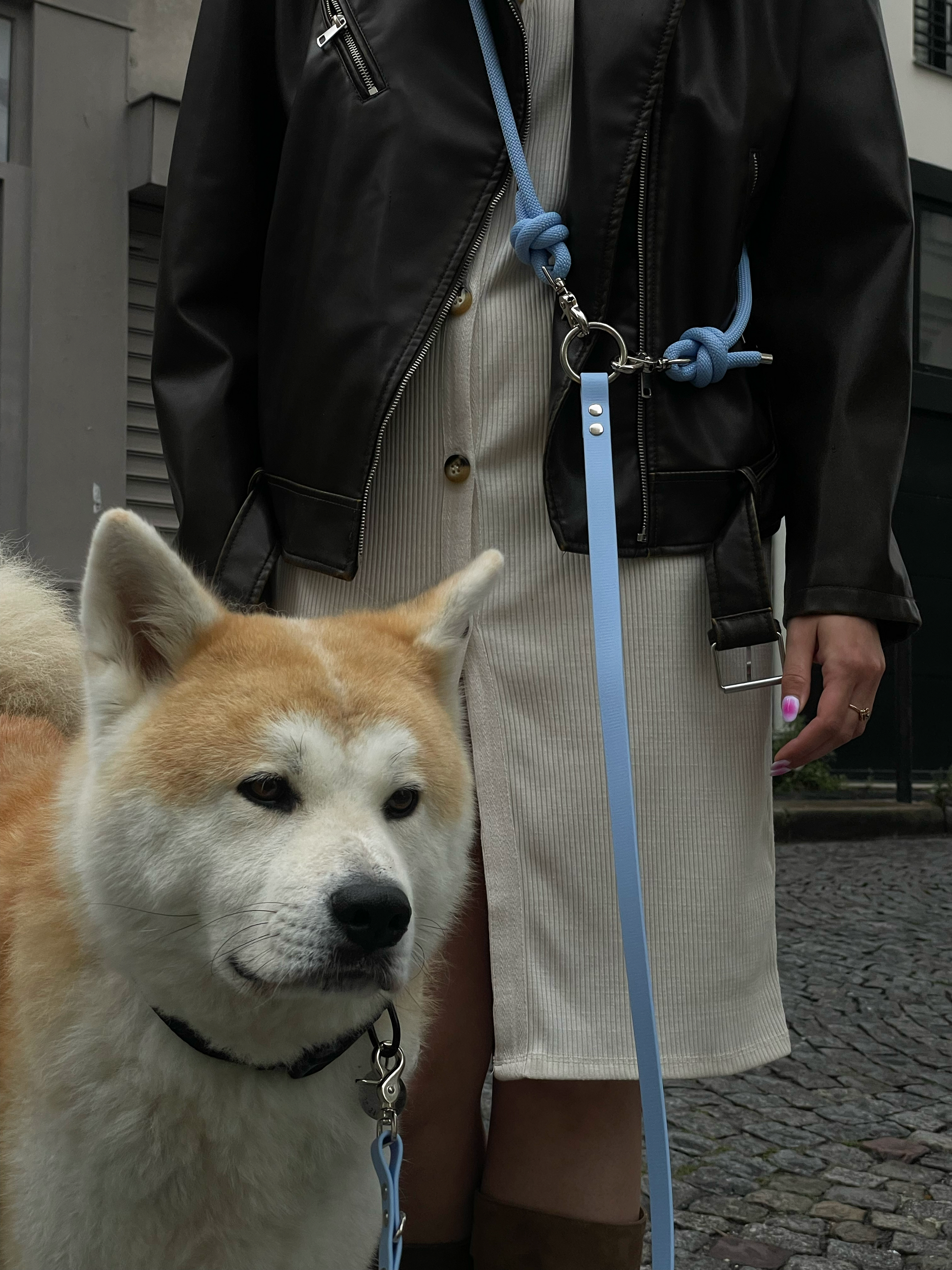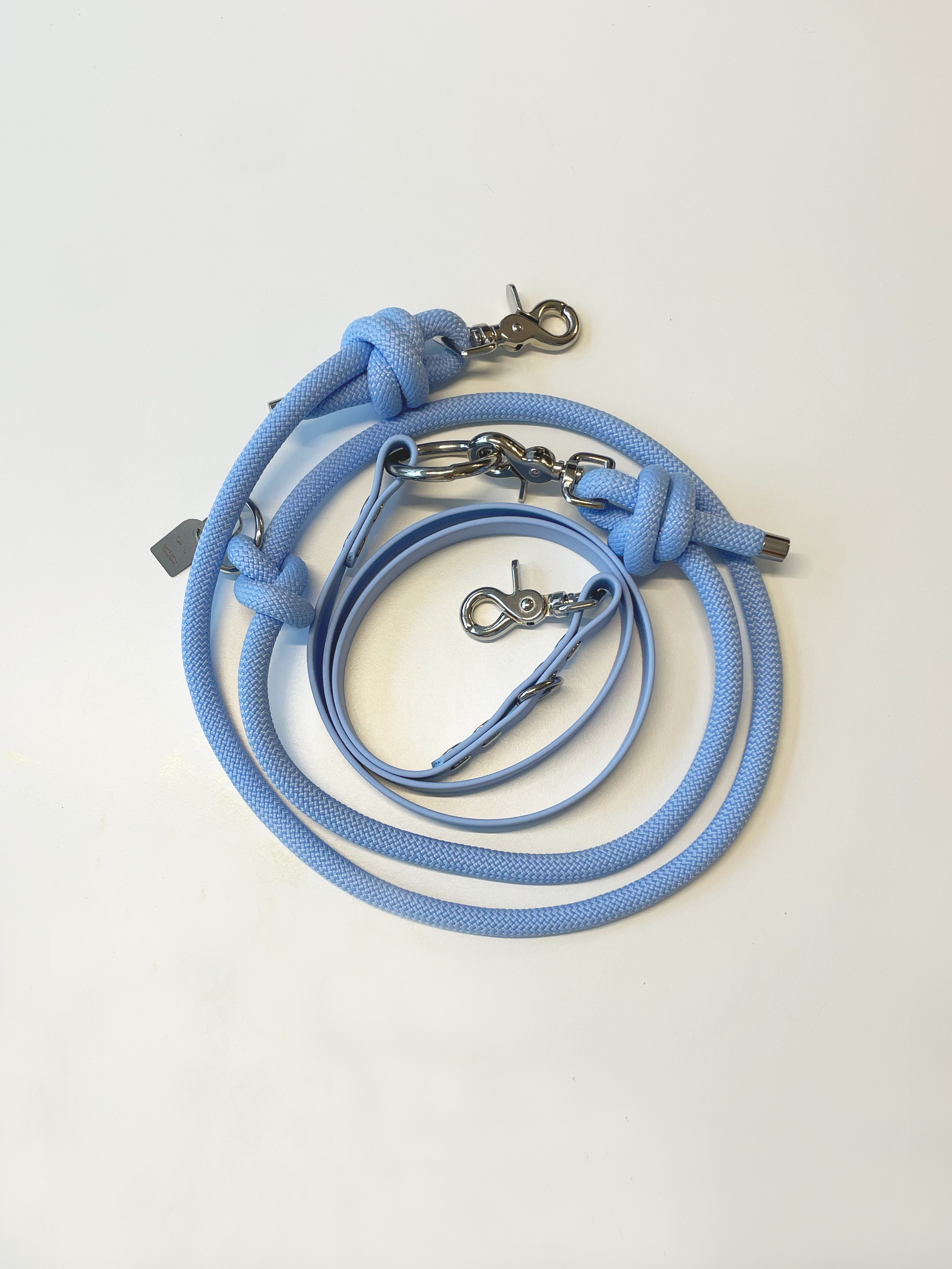 En Biothane© (un matériau innovant, visuellement proche du cuir, vegan, imperméable, facile à nettoyer, sans odeur et extrêmement résistant) et en corde de nylon (très résistante à la rupture, tout en étant extrêmement légère et facile à nettoyer).