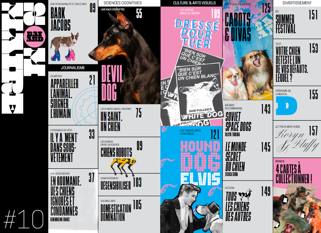 Bâtard est la 1ère revue dédiée à l'univers du Chien ! Une revue trimestrielle, 160 pages, 17 rubriques, des chiens, des chiens et encore des chiens ! 🐶