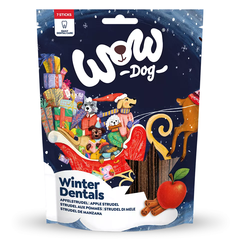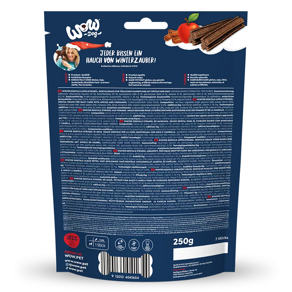 Avec les Winter Dentals, chaque bouchée devient un moment magique pour votre chien ! Ils combinent le goût festif de l'apfelstrudel (Strudel aux pommes) avec des soins dentaires naturels et sont parfaits pour se faire plaisir et se faire dorloter.